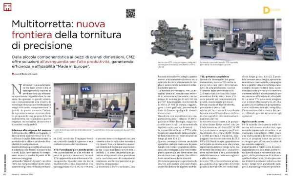 Soluzione alle esigenze del mercato A tal proposito, CMZ ha sviluppato le linee di torni multitorretta TTS e TTL cui focus è quello di massimizzare la produttività e offrire un’ elevata flessibilità di configurazione. Questa strategia permette all’ azienda di adattarsi alle diverse necessità dei clienti, dalla lavorazione di componenti minuti a quella di pezzi di dimensioni maggiori. La filosofia“ Made in Europe”, con oltre l’ 80 % dei componenti prodotti internamente negli otto centri di produzioe possono essere configurati con una torretta e due canali o due torrette e tre canali. Con un diametro massimo tornibile di 120 mm e una distanza tra i nasi mandrino di 638 mm, i modelli TTS sono progettati per garantire alta produttività e precisione nella realizzazione di componenti complessi, anche con materiali e geometrie impegnative. La struttura a banco inclinato, una