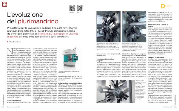 Nella produzione industriale di componenti torniti, dove i volumi e i tempi ciclo sono determinanti, il plurimandrino a CNC rappresenta oggi una scelta strategica per le aziende che devono coniugare volumi elevati e complessità crescente dei pezzi. L’ evoluzione della tecnologia CNC ha progressivamente modificato il concetto stesso di plurimandrino, introducendo un livello di controllo e flessibilità prima difficilmente raggiungibile con le architetture tradizionali a camme. Con la serie MS16, e in particolare con la versione MS16 Plus, INDEX introduce un’ evoluzione progettuale che combina la produttività tipica delle macchine multi-mandrino con la flessibilità, la precisione e il controllo di processo propri della tecnologia CNC. Un approccio innovativo studiato per rispondere alle esigenze di un’ industria manifatturiera sempre più orientata a lotti variabili, qualità costante e integrazione dei processi. In Italia, la macchina è distribuita in esclusiva da Synergon, partner di riferimento per soluzioni avanzate di tornitura. ni articolate con tempi ciclo ridotti e un controllo completo del processo produttivo. MS16 è configurato come tornio automatico plurimandrino a CNC con sei elettromandrini raffreddati a liquido, caratterizzati da velocità di rotazione indipendenti e programmabili. L’ architettura INDEX, infatti, prevede sei mandrini disposti su tamburo, ciascuno servito da unità operative a CNC, permettendo l’ esecuzione simultanea di più operazioni su pezzi diversi, con una sincronizzazione che ottimizza ogni fase della lavorazione e riduce drasticamente i tempi improduttivi. Questa soluzione inoltre consente di mantenere condizioni di taglio ottimali in ogni fase della lavorazione, migliorando la qualità superficiale dei pezzi, la rottura del truciolo e la durata degli utensili. La struttura compatta della macchina, unita a una disposizione razionale delle slitte e a un’ elevata accessibilità dell’ area di lavoro, facilita le operazioni di attrezzaggio e riduce in modo significativo i tempi di setup rispetto ai plurimandrino a camme tradizionali. Ogni stazione può essere equipaggiata con utensili fissi o motorizzati, slitte a tuffo, slitte trasversali con assi X e Z e unità di troncatura,