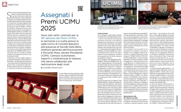 Appuntamento alla 50 ª edizione nel 2026 « Ringrazio le Università, gli studenti e le imprese coinvolte per il loro prezioso contributo a questa iniziativa. Anche quest’ anno- ha dichiarato Riccardo Rosa- è stato difficile definire la rosa dei vincitori a conferma dell’ alta qualità dei lavori presentati dedicati all’ industria della macchina utensile, dell’ automazione robotica, della digitalizzazione, delle nuove tecnologie e alla tematica della sostenibilità- economica, sociale e ambientale. L’ impegno e il risultato ottenuto dai sette neolaureati conferma l’ ottimo indirizzo che alcune università italiane, tra cui certamente, Politecnico di Milano, SAPIENZA-Università di Roma, Università di Pavia, Università Politecnica delle Marche, da cui provengono le numerose tesi ricevute per questa edizione, stanno dando al loro percorso di studi, facilitando così, in prospettiva, l’ operato delle aziende del settore ». « Ci diamo quindi appuntamento- ha aggiunto Davide Della Bella, direttore generale UCIMU- al 2026, anno in cui si celebrerà il cinquantesimo anno dell’ i- niziativa PREMI UCIMU. La cerimonia di premiazione si svolgerà nell’ ambito di 35. BI-MU, la biennale della macchina utensile in programma dal 13 al 16 ottobre a fieramilano Rho ». La 50esima edizione dell’ iniziativa si rivolge agli studenti che avranno conseguito la laurea nel periodo compreso tra luglio 2025 e giugno 2026, presso le facoltà di Ingegneria, Economia, Informatica, Disegno Industriale e Scienze della Comunicazione di politecnici e università italiane. Sono ammesse al concorso anche le tesi svolte presso università straniere, purché sviluppate in collaborazione con imprese associate a UCIMU- Sistemi Per Produrre.