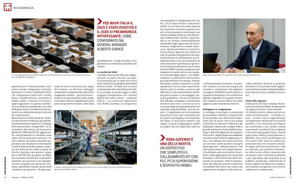 Le novità del 2026 I risultati ottenuti nel 2025 non rappresentano un punto d’ arrivo, ma quello di partenza per la sfida del nuovo anno, durante il quale Mayr presenterà diverse novità. « Il 2026 sarà un anno caratterizzato dal consolidamento delle tecnologie di monitoraggio e dalla maggiore integrazione con i sistemi digitali dei nostri clienti – conferma Surace – La novità più importante sarà ROBA-Gateway, un dispositivo
