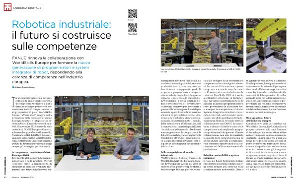 Dalla competizione al mondo industriale FANUC è Global Industry Partner di WorldSkills dal 2018 e Premium Sponsor di WorldSkills Europe dal 2022. Il rinnovo della partnership conferma una strategia di lungo periodo orien- tata allo sviluppo di un ecosistema di competenze che coinvolge scuole tecniche, centri di formazione, system integrator e aziende manifatturiere. L’ evento più recente dedicato alla robotica, EuroSkills 2025, si è svolto a settembre a Herning, in Danimarca, e ha visto la partecipazione di 13 squadre di giovani programmatori di robot provenienti da altrettanti Paesi europei. Le competizioni di Robot Systems Integration simulano scenari industriali reali, avvicinando i partecipanti alle sfide quotidiane dell’ automazione in fabbrica. Secondo Gates, la collaborazione con FANUC ha contribuito a elevare il livello tecnico delle competizioni e ad ampliare le prospettive professionali dei giovani: « Questa collaborazione non solo ha innalzato la qualità delle competizioni, ma ha anche aiutato i giovani a comprendere le numerose opportunità di carriera nei settori dell’ automazione e della produzione ».