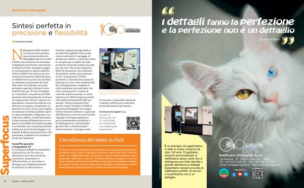 Da oltre un secolo, Rettificatrici Ghiringhelli S. p. A. è protagonista globale nella rettifica senza centri di altissima precisione. Apprezzata come“ Problem Solver” per l’ affidabilità delle sue soluzioni, realizza sistemi integrati capaci di garantire tolleranze“ al micron”, massima efficienza energetica e automazione avanzata. Ambasciatrice del Made in Italy, pone sostenibilità e sviluppo del capitale umano al centro della propria strategia, confermandosi motore d’ innovazione e posizionandosi tra i leader nel mercato tecnologico.
