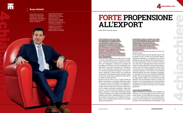DOTTOR BETTELLI, DAL LUGLIO 2023 LEI È PRESIDENTE DI FEDERMACCHINE, LA FEDERAZIONE NAZIONALE DELLE ASSOCIAZIONI DEI PRODUTTORI DI BENI STRUMENTALI, UN SETTORE SICURAMENTE TRA I PIÙ RILEVANTI PER L’ ECONOMIA NAZIONALE E TRA I PRINCIPALI PER L’ EXPORT ITALIANO, CONTRIBUENDO IN MODO SIGNIFICATIVO ALLA BILANCIA COMMERCIALE DEL PAESE. PUÒ DARCI UN SINTETICO PROFILO DELLA FEDERAZIONE? « Federmacchine rappresenta in Italia tutto il comparto dei beni strumentali, ovvero il mondo del machinery, i costruttori di macchine e impianti per l’ industria e per l’ artigianato. Si tratta di un comparto che ha raggiunto nel 2024 un valore di 53 miliardi di euro, dopo avere toccato il picco massimo di 57 miliardi nel 2023. Come evidenziato nella domanda, è un settore con una forte propensione all’ export: il 70 % del fatturato è destinato ai mercati esteri, con una bilancia commerciale estremamente positiva poiché la quota di meccanica strumentale importata è molto inferiore rispetto a quella esportata. Mi piace dire che siamo un po’ la spina dorsale del Made in Italy. Spesso si dà grande attenzione ai beni di consumo ad alta riconoscibilità, cioè quelli delle 3 A, Alimentare, Arredo, Automotive, ma dobbiamo ricordare che dietro ogni bene di consumo o bene durevole c’ è sempre un processo produttivo e, dietro quel processo, c’ è una macchina, un impianto, una tecnologia e, soprattutto, ci sono delle competenze. È grazie a queste competenze e tecnologie che il Made in Italy si afferma nel mondo. Contribuiamo per il 2,7-2,8 % al PIL nazionale e lo facciamo con un livello di riconoscibilità, anche se talvolta indiretta, attraverso i prodotti italiani che esportiamo ».