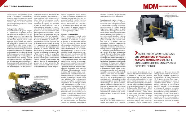 in aggiunta può diventare ancora più vantaggioso dal punto di vista economico perché consente l’ accesso agli incentivi legati al Piano Transizione 5.0. Ovviamente anche Robi rappresenta una tecnologia che consente di accedere a questo credito, in quanto migliora l’ efficienza di utilizzo delle macchine utensili e di conseguenza ne ottimizza il consumo energetico nel complesso. Per tutte le aziende interessate all’ acquisto di Robi e Robi jr, Gerardi offre un importante servizio orientato a fornire un supporto fiscale tramite consulenti esterni certificati, consentendo ai clienti di accedere in modo rapido e semplice ai benefici del Piano 5.0. www. techmec. it Maggio 2025 91