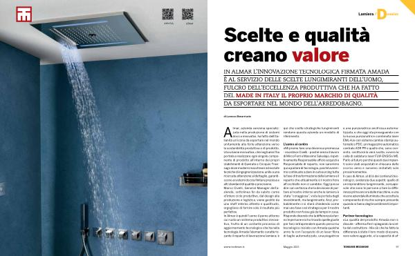Almar, azienda varesina specializzata nella produzione di sistemi doccia innovativi, ha fatto dell’ italianità un’ icona da esportare nel mondo unitamente alla forte attenzione verso la sostenibilità produttiva e di prodotto. Una visione innovativa, che negli anni l’ ha portata a realizzare ogni singolo componente di prodotto all’ interno dei propri stabilimenti di Gavirate e Cocquio Trevisago dove moderni macchinari ed evolute tecniche di ingegnerizzazione, unite a una ricercata attenzione al dettaglio, garantiscono ai sistemi doccia finiture preziose e alti standard di qualità e precisione. Marco Civelli, General Manager dell’ a- zienda, sottolinea fin da subito come « l’ intero ciclo produttivo, dal design alla produzione e logistica, viene gestito da uno staff interno attento e qualificato, orgoglioso di fornire solo il risultato più perfetto ». In Almar è quindi l’ uomo il perno attorno cui ruota un sistema produttivo innovativo, frutto di un costante processo di aggiornamento tecnologico che ha nella tecnologia Amada l’ elemento caratterizzante il reparto di lavorazione lamiera; è qui che scelte strategiche lungimiranti rendono questa azienda un modello di riferimento.
