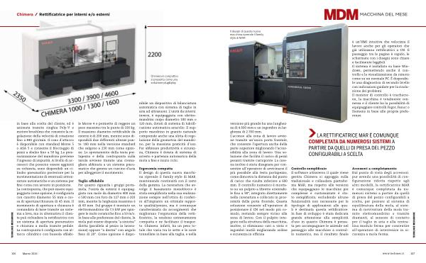 Ergonomia compatta Il design di questa nuova macchina riprende il family style di MAR, mantenendo continuità con il resto della gamma. La carenatura che avvolge il basamento monoblocco è stata semplificata nella sua realizzazione sempre nell’ ottica di conferire all’ impianto un ottimale rapporto qualità / prezzo, ma è comunque caratterizzata da accorgimenti che migliorano l’ ergonomia della rettificatrice, la rendono estremamente compatta e ne facilitano il trasporto. Chimera, infatti, ha un peso totale che varia tra le sette e le nove tonnellate in base alla taglia, e nella