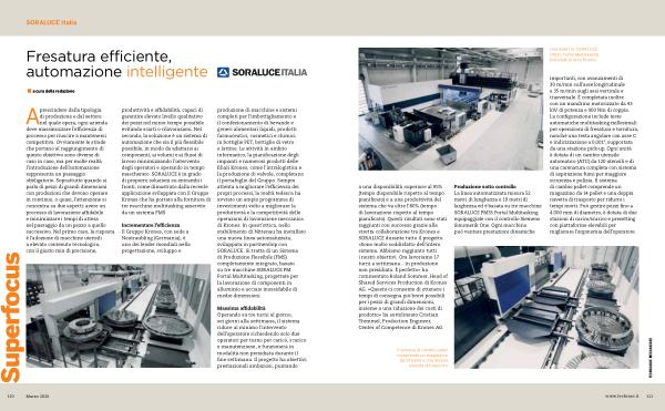 Produzione sotto controllo La linea automatizzata misura 52 metri di lunghezza e 19 metri di larghezza ed è basata su tre macchine SORALUCE PM35 Portal Multitasking equipaggiate con il controllo Siemens Sinumerik One. Ogni macchina può vantare prestazioni dinamiche importanti, con avanzamenti di 30 m / min sull’ asse longitudinale e 35 m / min sugli assi verticale e trasversale. È completata inoltre con un mandrino motorizzato da 43 kW di potenza e 900 Nm di coppia. La configurazione include teste automatiche multitasking millesimali per operazioni di fresatura e tornitura, nonché una testa angolare con asse C e indicizzazione a 0,001 °, supportata da una stazione pick-up. Ogni unità è dotata di un cambio utensile automatico( ATC) da 120 utensili e di una carenatura completa con sistema di aspirazione fumi per maggiore sicurezza e pulizia. Il sistema di cambio pallet comprende un magazzino da 14 pallet e una doppia navetta di trasporto per ridurre i tempi morti. Può gestire pezzi fino a 4.000 mm di diametro, è dotata di due stazioni di carico / scarico e presetting con piattaforme elevabili per migliorare l’ ergonomia dell’ operatore.
