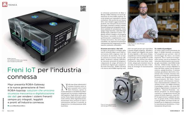 Un cambio di paradigma Al centro delle novità presentate da Mayr c’ è ROBA-Gateway, un modulo IoT progettato per portare i dati di monitoraggio dei freni a un livello superiore. Non si tratta di un dispositivo isolato, ma di un elemento che valorizza ulteriormente una tecnologia già consolidata come ROBA-brake checker. « ROBA-brake checker monitora da anni in modo affidabile lo stato del freno, senza l’ uso di sensori esterni », spiega Bozzolan. Il sistema analizza grandezze elettriche e funzionali come corrente, tensione, temperatura e tempi di commutazione, fornendo una fotografia precisa del comportamento del freno. Finora, però, queste informazioni rimanevano sostanzialmente confinate a un utilizzo locale. Con ROBA-Gateway, il paradigma cambia. « Gli stessi dati vengono digitalizzati e trasmessi via Ethernet- chiarisce Bozzolan- rendendo possibile un monitoraggio continuo e l’ integrazione diretta nei sistemi di livello superiore, come PLC, PC di supervisione o ambienti di analisi ». In questo modo, il freno diventa a tutti gli effetti una fonte di dati utilizzabili per la diagnostica avanzata, la manutenzione predittiva e l’ ottimizzazione dei processi.