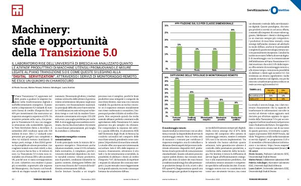La strada è ancora lunga, ma i dati mostrano chiaramente che la capacità di trasformare le informazioni raccolte in servizi ad elevato valore aggiunto sarà decisiva per sfruttare appieno le opportunità della Transizione 5.0 e per accompagnare il settore machinery nel percorso verso l’ industria del futuro. Per approfondire e conoscere alcuni casi di successo di questo percorso, vi invitiamo a partecipare al prossimo XXII ASAP Forum, dal titolo“ Progresso o stallo nella transizione ai servizi digitali”, in programma il 20 e 21 novembre a Novara( ulteriori informazioni e iscrizioni: https:// www. asapsmf. org / 21-asap-service-management-forum /). Gli autori Nicola Saccani, Professore Laboratorio RISE, Università degli Studi di Brescia Matteo Patussi, Collaboratore Laboratorio RISE Federico Adrodegari, Ricercatore Laboratorio RISE, Università degli Studi di Brescia Laura Scalvini, Dottoranda Laboratorio RISE, Università degli Studi di Brescia www. techmec. it Novembre 2025 31