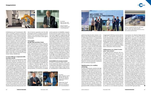 Le nuove sfide per i componenti delle macchine utensili Negli ultimi anni, la progettazione delle macchine utensili ha vissuto una trasformazione radicale: la tendenza è verso sistemi multifunzionali in grado di lavorare in parallelo, riducendo i tempi ciclo e aumentando la produttività. Questo cambio di paradigma ha portato all’ adozione diffusa degli elettromandrini, nei quali il motore è integrato direttamente nel mandrino, consentendo un controllo molto più fine del moto e della velocità. L’ elevata densità di potenza, le altissime velocità di rotazione e la necessità di garantire un funzionamento stabile e silenzioso hanno innalzato drasticamente i requisiti di prestazione dei componenti. I cuscinetti, in particolare, devono sopportare carichi elevati con attrito ridotto, mantenere precisioni dimensionali inferiori al micron e garantire una vita utile prolungata anche in condizioni operative severe. E sono questi gli obiettivi che l’ a- zienda si pone con il nuovo centro aperto in Piemonte.