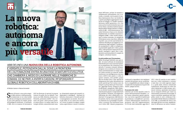 ABB DELINEA UNA NUOVA ERA DELLA ROBOTICA AUTONOMA E VERSATILE, POTENZIATA DALL’ AI, DOVE LA FRONTIERA DELL’ AUTOMAZIONE ENTRA IN UNA FASE DI MATURITÀ EVOLUTIVA CHE CAMBIERÀ IL MODO DI LAVORARE NELLE FABBRICHE DI DOMANI. CE NE PARLA ANDREA CASSONI, RESPONSABILE GLOBALE ROBOTICA COLLABORATIVA DI ABB.