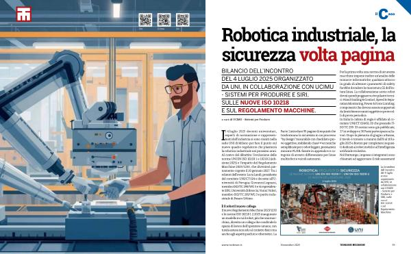 Il 4 luglio 2025 docenti universitari, esperti di normazione e rappresentanti dell’ industria si sono riuniti nella sede UNI di Milano per fare il punto sul nuovo quadro regolatorio che plasmerà la robotica industriale nei prossimi anni. Al centro del dibattito: l’ evoluzione delle norme UNI EN ISO 10218 1 e 10218 2( edizione 2025) e l’ impatto del Regolamento Macchine 2023 / 1230, che diventerà pienamente cogente il 20 gennaio 2027. Tra i relatori dell’ evento: Luca Landi, presidente del comitato UNI / CT 024 e docente all’ U- niversità di Perugia; Giovanni Legnani, membro ISO / TC 299 / WG 3 e vicepresidente SIRI, Università di Brescia; Vanni Valeri, membro ISO / TC 299 / WG 3 e perito industriale di Pesaro Urbino.