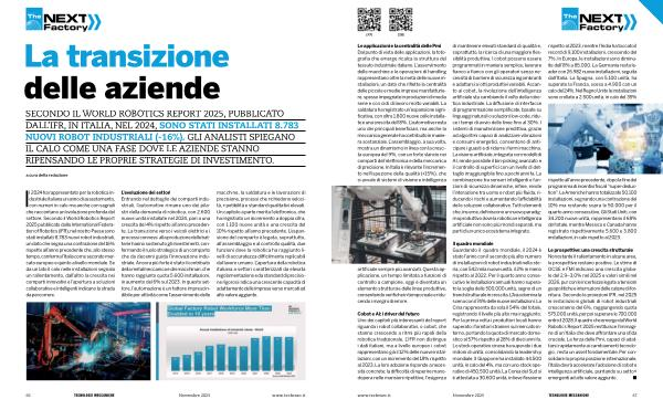 Le prospettive: una crescita strutturale Nonostante il rallentamento in alcune aree, le prospettive restano positive. Le stime di OCSE e FMI indicano una crescita globale del 2,9 – 3,0 % nel 2025 e valori simili nel 2026, pur con le incertezze legate a tensioni geopolitiche e interruzioni delle catene di fornitura. Secondo le proiezioni IFR, nel 2025 le installazioni globali di robot industriali cresceranno del 6 %, raggiungendo quota 575.000 unità, per poi superare le 700.000 entro il 2028. Il quadro che emerge dal World Robotics Report 2025 restituisce l’ immagine di un’ Italia che deve affrontare una sfida cruciale. La forza delle Pmi, capaci di adattarsi rapidamente ai cambiamenti tecnologici, resta un asset fondamentale. Per consolidare la propria posizione internazionale, l’ Italia dovrà accelerare l’ adozione di cobot e intelligenza artificiale, puntando su settori emergenti ad alto valore aggiunto. www. techmec. it Novembre 2025 67