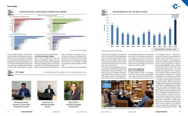 Concorrenza agguerrita, dazi e il nodo OTR 2024 Il subcontinente ospita 1.500 imprese locali di settore, di cui una trentina“ big” capaci di coprire il 70 % del fatturato. La pressione dei produttori cinesi e la strategia“ China + 1” delle multinazionali rendono indispensabile per i player italiani bilanciare un alto contenuto tecnologico e l’ adattamento a un mercato estremamente sensibile al prezzo. Sul fronte doganale, le macchine( voci HS 8456 8465) scontano un Basic Customs Duty fra il 2 % e il 7,5 %, a cui si sommano l’ IGST al 18 % e un Social Welfare Surcharge del 10 %. L’ assenza di un accordo di libero scambio UE-India mantiene il prelievo pieno, mentre progrediscono i negoziati con Londra e con l’ EFTA. Il vero spartiacque, però, è costituito dall’“ Omnibus Technical Regulation Order”( OTR): certificazione obbligatoria BIS, rappresentante indiano autorizzato e registrazione locale già in vigore per molti prodotti sebbene l’ obbligo pieno sulle macchine utensili sia slittato al 2026. Chi non è conforme rischia blocchi doganali e penalità milionarie. Quanto sopra dà il quadro di un mercato dalle mille opportunità di crescita ma piuttosto articolato e complesso da approcciare, soprattutto se fatto singolarmente e non attraverso una rete d’ impresa come ITC India, che si conferma essere la strada più conveniente e percorribile sotto ogni punto di vista. www. techmec. it Ottobre 2025 53