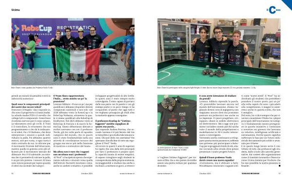 Quindi il buon professor Torda dovrà creare una nuova squadra! « Certamente, ma è abituato a farlo. Noi abbiamo conosciuto i ragazzi scelti come“ nostri eredi”. Il“ Prof.” ha individuato gli studenti che potrebbero prendere il nostro posto, poi un po’ alla volta capirà chi sono i più adatti alla competizione, e magari lo aiuteremo anche in questa scelta, che non è semplice. Del resto, lui ci dice sempre che per riuscire a mantenere l’ Italia tra i player principali dell’ innovazione tecnologica è fondamentale essere protagonisti in queste iniziative e continuare a investire sui giovani che lavorano su robotica, intelligenza artificiale e automazione. Perché questo significa rafforzare le basi per un futuro industriale decisamente più solido e avanzato per il Paese. E in questo lungo lavoro serve il contributo di tutti, dai professori agli studenti, dalle scuole alle autorità governative, dai contest alle organizzazioni come il Comitato Leonardo e l’ Associazione Ucimu-Sistemi per Produrre che ha reso possibile la nostra presenza in Brasile ». www. techmec. it Ottobre 2025 57