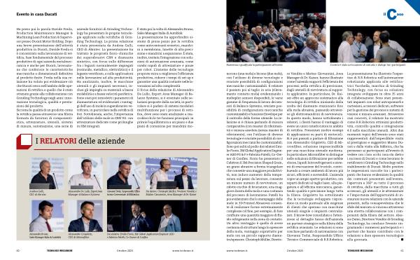 La presentazione ha illustrato l’ expertise di R. R. Robotica nell’ automazione robotizzata applicata alle rettificatrici Tacchella, marchio di Grinding Technology, con focus su soluzioni integrate sviluppate in oltre 35 anni di collaborazione. Sono stati presentati impianti con robot antropomorfi e cartesiani, accessori dedicati, software per la gestione dei processi e sistemi di visione e misura avanzati. Attraverso casi concreti, il relatore ha mostrato come R. R. Robotica ottimizzi produttività, controllo qualità e integrazione 4.0 nelle macchine utensili. Altri due momenti topici dell’ evento sono stati rappresentati dall’ imperdibile visita al prestigioso e suggestivo Museo Ducati e dalla visita alla fabbrica, che ha permesso ai partecipanti all’ evento di vedere con i loro occhi cosa sta dietro i successi di Ducati e come lavorano le rettificatrici Grinding Technology nello stabilimento di Ducati. Molto positive le impressioni raccolte tra i partecipanti che hanno evidenziato la qualità dei contenuti presentati nell’ evento, l’ apertura a 360 ° su tutto il processo di rettifica, dalla macchina a tutti gli accessori, gli utensili e le attrezzature e l’ importanza dell’ opportunità di instaurare nuove relazioni con le aziende presenti, nella consapevolezza che le sfide del mercato si vincono attraverso una stretta collaborazione con i componenti della filiera del settore. Alessio Zemo, Direttore Vendite di Grinding Technology, ha concluso l’ evento ringraziando i numerosi partecipanti e i partner che hanno contributo con le relazioni a dare spessore tecnologico alla giornata.