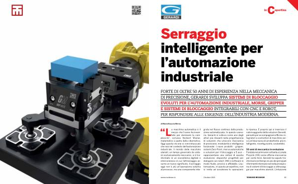 grata nel flusso continuo della produzione automatizzata. In questo scenario, Gerardi si colloca come uno degli attori più rilevanti nella progettazione di soluzioni che uniscono meccanica di precisione, modularità e intelligenza funzionale. I nuovi prodotti- gripper, sistemi Zero Point, morse automatiche e soluzioni per il bloccaggio a 5 assi- rappresentano una sintesi di questa evoluzione: dispositivi progettati per dialogare con robot, CNC e software in modo fluido, preciso e affidabile. L’ automazione, in questa prospettiva, non si limita ad accelerare le operazioni: mezzo che l’ uomo ha inventato per dominare la complessità”, scriveva Norbert Wiener, matematico e padre della cibernetica. Oggi questa visione si concretizza più che mai nel contesto dell’ automazione industriale. Il mondo delle macchine utensili, un tempo governato da sistemi esclusivamente meccanici, si è trasformato in un ecosistema digitale e interconnesso in cui l’ attrezzaggio assume un nuovo significato. Il serraggio oggi non è più un’ operazione esterna al processo, ma una componente intele ripensa. E proprio qui si inserisce il valore aggiunto delle soluzioni Gerardi, pensate per accompagnare officine, integratori e costruttori di macchine verso un’ idea nuova di produttività: più intelligente, riconfigurabile, sostenibile.