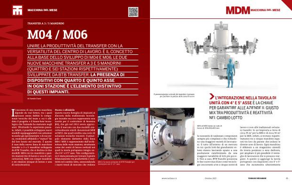 la necessità di realizzare componenti sempre più complessi e che richiedono una maggiore varietà di lavorazioni. Il tutto all’ interno di un mercato in cui i pochi lotti dai grandissimi volumi stanno lasciando spazio a una produzione caratterizzata da una maggiore variabilità di lotti più piccoli. Non a caso, BTB Transfer posiziona le due nuove macchine come tecnologie concorrenti a tre o cinque centri di lavoro e non alle tradizionali soluzioni transfer. In un’ impronta a terra di circa 35 m 2 per la M04 e di circa 50 m 2 per la M06, infatti, si trovano rispettivamente tre e cinque mandrini separati tra loro da paratie che isolano le diverse aree di lavoro. Ogni mandrino è abbinato a un magazzino utensili da trenta posizioni a esso dedicato, per ampliare il più possibile il ventaglio di lavorazioni che si possono eseguire. A questo si aggiunge la tavola portapezzo con dispositivi con 4 ° e 5 ° asse che incrementa ulteriormente www. techmec. it Ottobre 2025 85