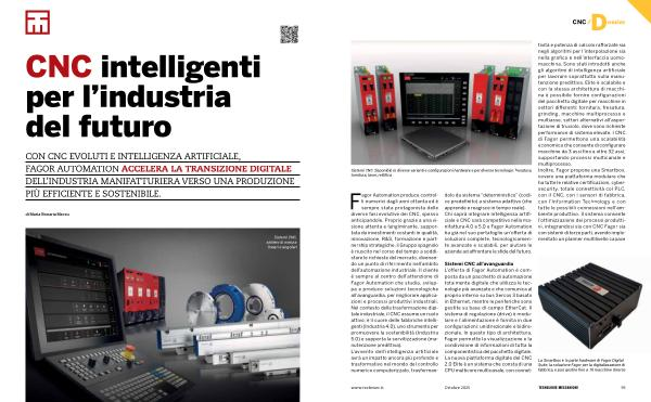 Fagor Automation produce controlli numerici dagli anni ottanta ed è sempre stata protagonista delle diverse fasi evolutive dei CNC, spesso anticipandole. Proprio grazie a una visione attenta e lungimirante, supportata da investimenti costanti in qualità, innovazione, R & S, formazione e partnership strategiche, il Gruppo spagnolo è riuscito nel corso del tempo a soddisfare le richieste del mercato, divenendo un punto di riferimento nell’ ambito dell’ automazione industriale. Il cliente è sempre al centro dell’ attenzione di Fagor Automation che studia, sviluppa e produce soluzioni tecnologiche all’ avanguardia, per migliorare applicazioni e processi produttivi industriali. Nel contesto della trasformazione digitale industriale, il CNC assume un ruolo attivo: è il cuore delle fabbriche intelligenti( Industria 4.0), uno strumento per promuovere la sostenibilità( Industria 5.0) e supporta la servitizzazione( manutenzione predittiva). L’ avvento dell’ intelligenza artificiale avrà un impatto ancora più profondo e trasformativo nel mondo del controllo numerico computerizzato, trasformandolo da sistema“ deterministico”( codice predefinito) a sistema adattivo( che apprende e reagisce in tempo reale). Chi saprà integrare intelligenza artificiale e CNC sarà competitivo nella manifattura 4.0 e 5.0 e Fagor Automation ha già nel suo portafoglio un’ offerta di soluzioni complete, tecnologicamente avanzate e scalabili, per aiutare le aziende ad affrontare le sfide del futuro.