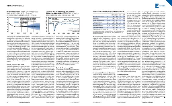 Il commercio estero Per concludere, alcuni numeri sul commercio estero. Il trend resta positivo per quanto riguarda il mercato UE( che vale il 52 % dell’ export italiano), mentre registra difficoltà nel resto del mondo. Sulla base dei dati di metà anno l’ Istat stima, per l’ interscambio commerciale con i Paesi extra UE27, una riduzione tendenziale dell’ export dovuta alle minori vendite di energia(-35,3 %), beni di consumo durevoli(-13,0 %), beni strumentali(-9,7 %) e beni intermedi(-7,2 %); per contro, aumenta l’ export di beni di consumo non durevoli(+ 6,8 %). L’ import registra una flessione tendenziale del 3,6 %, spiegata principalmente dalla contrazione degli acquisti di energia(-13,3 %) e beni strumentali(-12,0 %). Guardando ai mercati geografici, si rilevano ampie riduzioni su base annua delle esportazioni verso Cina(-22,8 %) e Turchia(-22,7 %); si riducono anche le vendite verso Regno Unito(-9,6 %) e Paesi Mercosur(-6,2 %), mentre crescono quelle verso Svizzera(+ 9,2 %), Paesi ASEAN(+ 4,4 %) e Stati Uniti(+ 2,5 %). Le importazioni da Stati Uniti(+ 18,5 %) e Cina(+ 11,4 %) registrano un marcato aumento tendenziale. Per contro, diminuiscono gli acquisti da tutti gli altri principali Paesi partner extra UE27; le riduzioni tendenziali più ampie riguardano Paesi OPEC(-28,9 %), Regno Unito(-18,8 %) e India(-13,3 %). Guardando ai settori merceologici, la riduzione congiunturale dell’ export verso i Paesi extra UE è determinata soprattutto dalle minori vendite di beni intermedi e beni strumentali. Su base annua la flessione tendenziale riguarda tutti i raggruppamenti, tranne i beni di consumo non durevoli, ed è per oltre due terzi dovuta alla contrazione delle vendite dirette verso Cina, Turchia e Regno Unito. L’ import diminuisce su base mensile e torna a flettere su base annua; sia la riduzione congiunturale che quella tendenziale riguardano tutti i raggruppamenti, a esclusione di beni di consumo non durevoli. Nei primi cinque mesi del 2025, la dinamica tendenziale dell’ export verso i Paesi extra UE è moderatamente positiva(+ 0,5 %; + 1,3 % al netto dell’ energia), mentre quella dell’ import è più sostenuta(+ 8,4 %). Il saldo commerciale con i Paesi extra UE è positivo(+ 18,9 miliardi di euro), ma la tendenza è di marcata riduzione rispetto al 2024. Last but not least, la visione sul prossimo futuro degli imprenditori. Secondo l’ ultima rilevazione del CSC( Centro Studi Confindustria) rivolta alle grandi imprese associate, nel secondo trimestre le aspettative sono lievemente più caute rispetto al primo: aumenta il numero di intervistati che crede che la produzione rimarrà costante( 62,4 %), diminuiscono gli ottimisti( 23,8 %), mentre resta quasi inalterata la quota di imprese che prevedono una diminuzione( 13,8 %). Permane il pessimismo su costi di produzione, condizioni finanziarie e disponibilità degli impianti; su quest’ ultima area si registra un peggioramento delle aspettative. www. techmec. it Settembre 2025 43