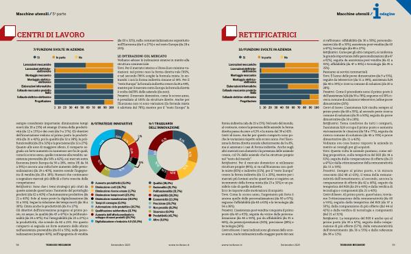 LE INTERAZIONI COL MERCATO Vediamo adesso le indicazioni emerse in merito alla struttura commerciale. Torni. Per il mercato interno e l’ Area Euro minime variazioni: nel primo caso la forma diretta vale l’ 89 %, e nel secondo l’ 86 % sceglie la formula mista. In entrambi i casi la forma indiretta rimane al 14 %. Per il“ resto Europa” la formula indiretta cresce da 26 a 44 %, mentre per il mercato extra Europa la formula diretta è scelta dall’ 8 % delle aziende( da zero). Fresatrici. Il mercato domestico, come lo scorso anno, è presidiato al 100 % da strutture dirette. Anche per l’ Eurozona non vi sono variazioni( la formula mista è adottata dal 78 %), mentre per il“ resto Europa” la sempre considerato importante: diminuzione tempi morti( da 18 a 23 %) ed emerge il tema della produttività( da 12 a 15 %) e dei costi( da 9 a 17 %). Gli obiettivi dell’ innovazione vedono al primo posto la produttività( da 31 a 42 %), poi la qualità( da 32 a 38 %), la polifunzionalità( da 29 a 32 %) e la precisione( da 12 a 27 %). Quanto alle aree di maggiore sforzo, il comparto segnala un forte aumento in numerose are fra le quali, come lo scorso anno, quelle connesse alla vendita: assistenza prevendita( da 54 % a 42 %), sui mercati extra Eurozona( resto Europa da 36 a 28 %, extra UE da 34 a 35 %) e ancora una volta forte aumento delle personalizzazioni( da 29 a 40 %), mentre scende l’ ingegneria di vendita( da 28 a 18 %). Numeri che continuano a segnalare mercati più difficili e forte crescita della competizione. Rettificatrici. Sono due i temi strategici più citati da queste aziende quest’ anno: l’ aumento del portafoglio prodotti( da 62 a 40 %) e l’ automazione produttiva( da 21 a 40 %). Solo al terzo posto la digitalizzazione( da 51 a 35 %). Segue la riduzione dei tempi morti( da 36 a 30 %). Citata anche la produttività( da 9 a 27 %). Gli obiettivi dell’ innovazione pongono al primo posto, ex aequo, la qualità( da 43 a 47 %) e la polifunzionalità( da 24 a 47 %). Poi l’ integrabilità( da 23 a 27 %) e la produttività, che scende da 40 a 25 %. Per questo comparto si segnala un forte aumento dello sforzo nell’ assistenza prevendita( da 60 a 55 %), nelle personalizzazioni( sempre 40 %), nell’ ingegneria di vendita