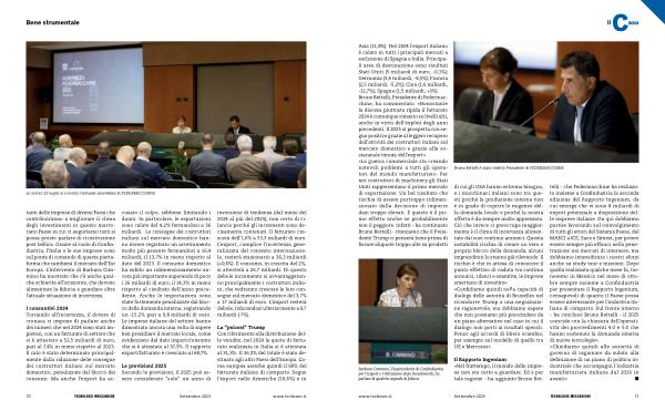 Le previsioni 2025 Secondo le previsioni, il 2025 può essere considerato“ solo” un anno di inversione di tendenza( dal meno del 2024 al più del 2025), non certo di rilancio perché gli incrementi sono decisamente contenuti. Il fatturato crescerà dell’ 1,6 % a 53,3 miliardi di euro. L’ export, complice l’ incertezza generalizzata del contesto internazionale, resterà stazionario a 36,3 miliardi(+ 0,6 %). Il consumo, in crescita del 2 %, si attesterà a 26,7 miliardi. Di questo debole incremento si avvantaggeranno principalmente i costruttori italiani, che vedranno crescere le loro consegne sul mercato domestico del 3,7 % a 17 miliardi di euro. L’ import resterà debole, riducendosi ulteriormente a 9,7 miliardi(-1 %).