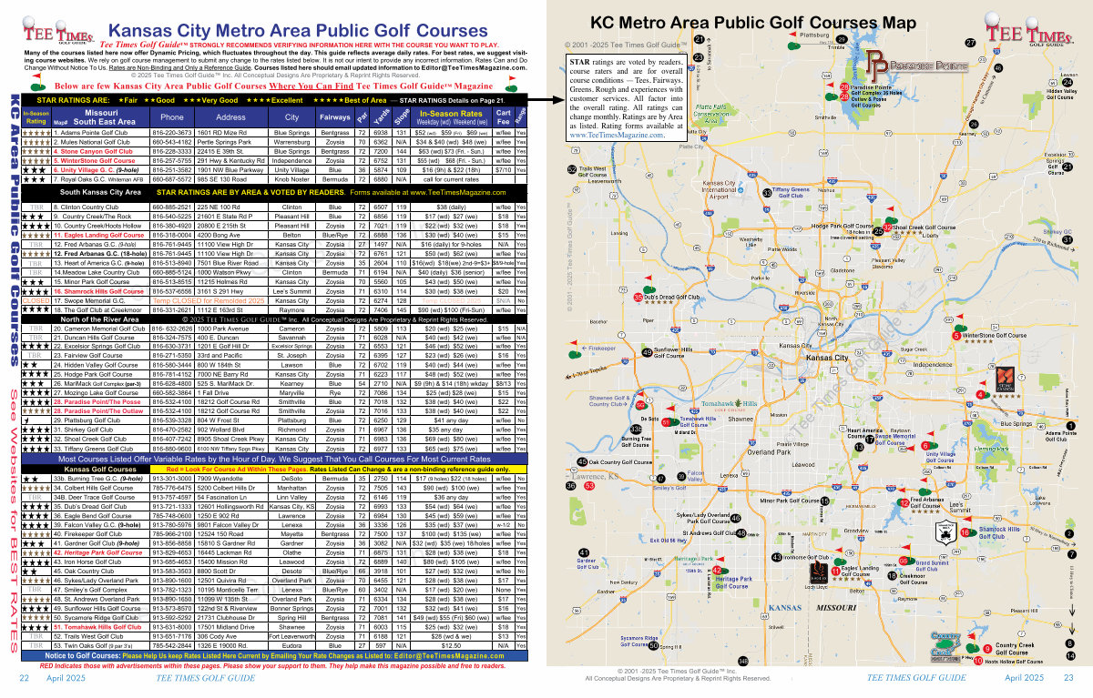 STAR ratings are voted by readers, course raters and are for overall course conditions— Tees, Fairways, Greens, Rough and experiences with customer services. All factor into the overall rating. All ratings can change monthly. Ratings are by Area as listed. Rating forms available at www. TeeTimesMagazine. com.