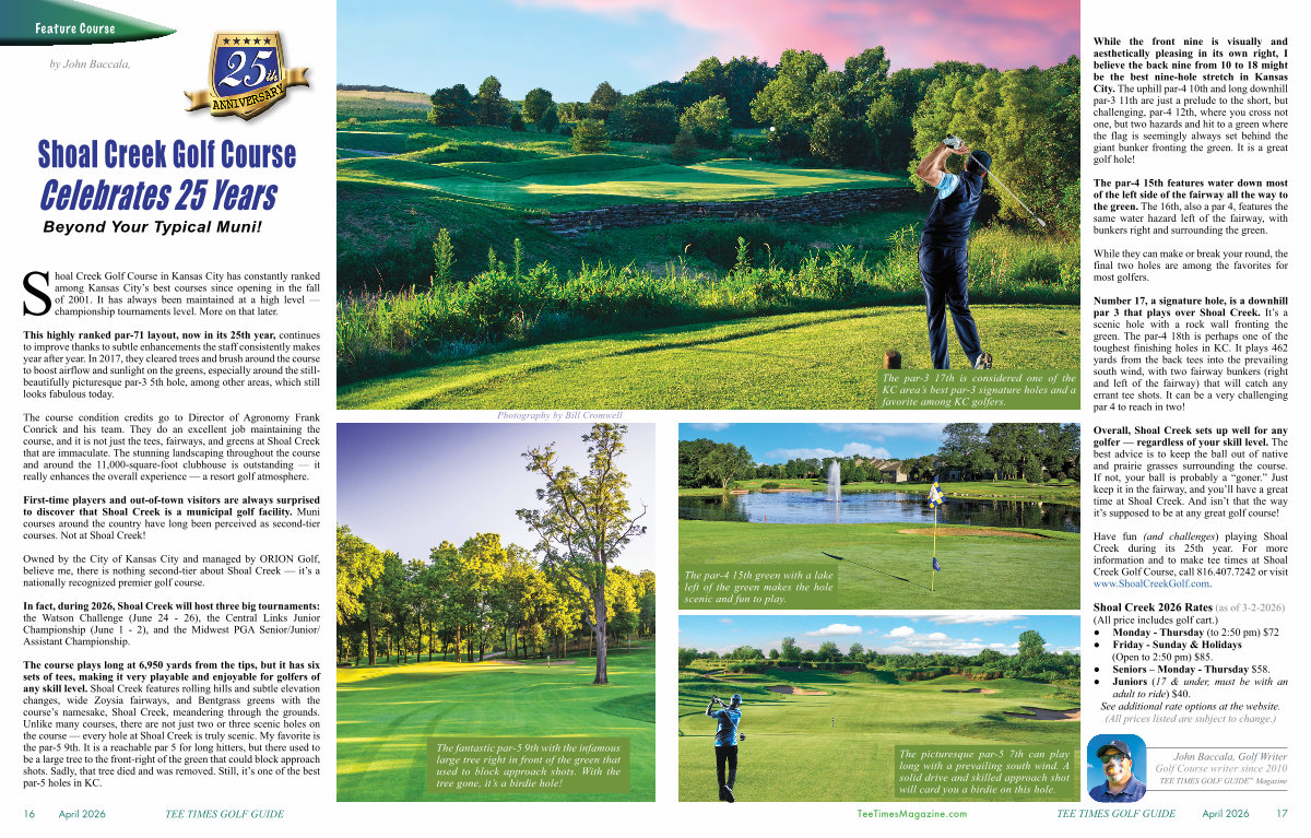 Shoal Creek Golf Course in Kansas City has constantly ranked among Kansas City’ s best courses since opening in the fall of 2001. It has always been maintained at a high level— championship tournaments level. More on that later.