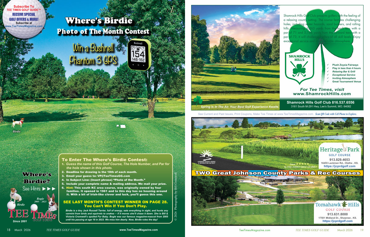 2. Deadline for drawing is the 18th of each month. 3. Email your guess to: VP @ TeeTimesGG. com 4. In Subject Line:( Insert phrase)“ Photo of the Month.” 5. Include your complete name & mailing address. We mail your prize. 6. Hint: This south KC area course, was originally owned by four families. It opened in 1961 and to this day has no housing around it. With a bit of Irish-like clover and luck, you’ ll guess this one.
