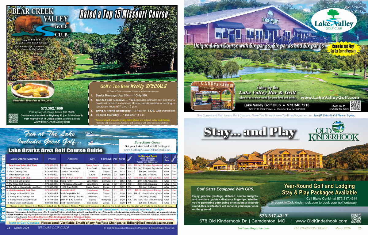 2. Deer Chase Golf Club 573-346-6117 770 Deere Chase Rd Linn Creek Bermuda 71 6544 129 $ 55( wd) $ 75( we) Adjustable w / fee Yes 3. Eldon Country Club 573-392-4172 35 Golf Course Rd Eldon Zoysia 70 6373 124 $ 56( wd) $ 62( we) w / fee Yes 4. Indian Rock Golf Club 573-372-3023 State Rd O Laurie Bermuda 72 6380 124 $ 62( wd) $ 70( we) w / fee Yes 5. Lake Valley Golf Club 573-346-7218 Hwy 54 & Lk Rd 54-79 Camdenton Bermuda 72 6373 124 $ 79( wd) $ 89( we) May-Oct. w / fee Yes 6. The Cove Golf Course 573-365-8532 State Rd HH Lake Ozark Bermuda 71 6553 136 $ 69- $ 95 Adjustable w / fee Yes 7. The Ridge Golf Course 573-365-8544 170 Seasons Ridge Dr Lake Ozark Zoysia 72 6447 130 $ 69- $ 95 Adjustable w / fee Yes 8. The Oaks at Margaritaville Lake Resort 573-348-8522 1524 State Rd KK Osage Beach Zoysia 71 6432 134 $ 69( wd) $ 85( we) w / fee Yes 9.. Old Kinderhook Golf Club 573-317-3573 Lake Rd 54-80 Camdenton Zoysia 71 6821 137 $ 85 / $ 105 Dynamic Pricing w / fee Yes 10. Osage National Golf Club 573-365-1950 400 Osage Hills Rd Lake Ozark Zoysia 72 7150 145 $ 89- $ 110 Adjustable by hour w / fee Yes 11. Rolling Hills Country Club 573-378-5109 13986 Country Club Rd Versailles Zoysia 71 6590 120 $ 40( wd)- 47( we) w / fee Yes 12. Redfield Golf & Country Club 573-498-0110 Hwy 54 & 17 Junction Eugene Bentgrass 72 6720 125 $ 50( Mon-Thur) $ 65( Fri-Sun) w / fee Yes 13. Triple Creek Golf Course 660-668-4653 333 Triple Creek Dr Cole Camp Zoysia 71 6029 119 $ 36( wd) $ 38( we) w / fee Yes Please note: Green Fee Rates Listed are In-Season Rates. Visit golf course websites for best rates by the day of week or the hour of day.