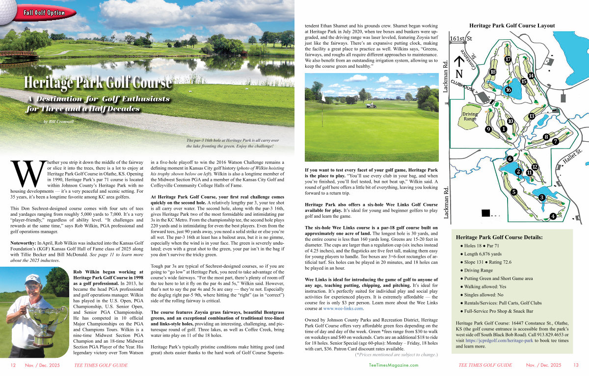 Whether you strip it down the middle of the fairway or slice it into the trees, there is a lot to enjoy at Heritage Park Golf Course in Olathe, KS. Opening in 1990, Heritage Park’ s par 71 course is located within Johnson County’ s Heritage Park with no housing developments— it’ s a very peaceful and scenic setting. For 35 years, it’ s been a longtime favorite among KC area golfers.