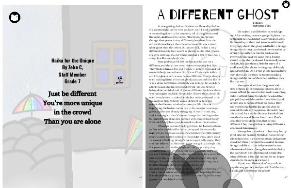 Haiku for the Unique By Zeke C, Staff Member Grade 7 Just be different You’re more unique in the crowd Than you are alone 46