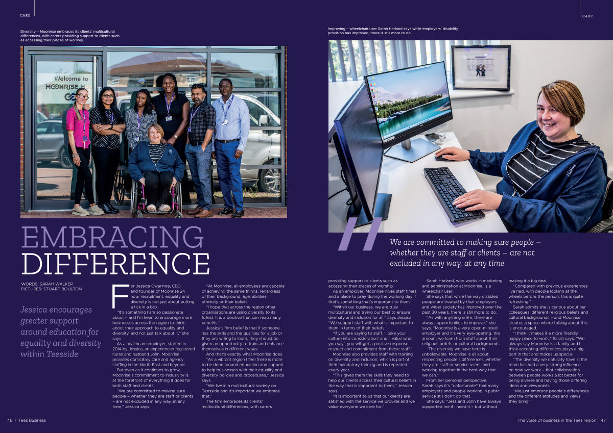 As a healthcare employer, started in 2014 by Jessica, an experienced registered nurse and husband John, Moonrise provides domiciliary care and agency staffing in the North-East and beyond. But even as it continues to grow, Moonrise’ s commitment to inclusivity is at the forefront of everything it does for both staff and clients.