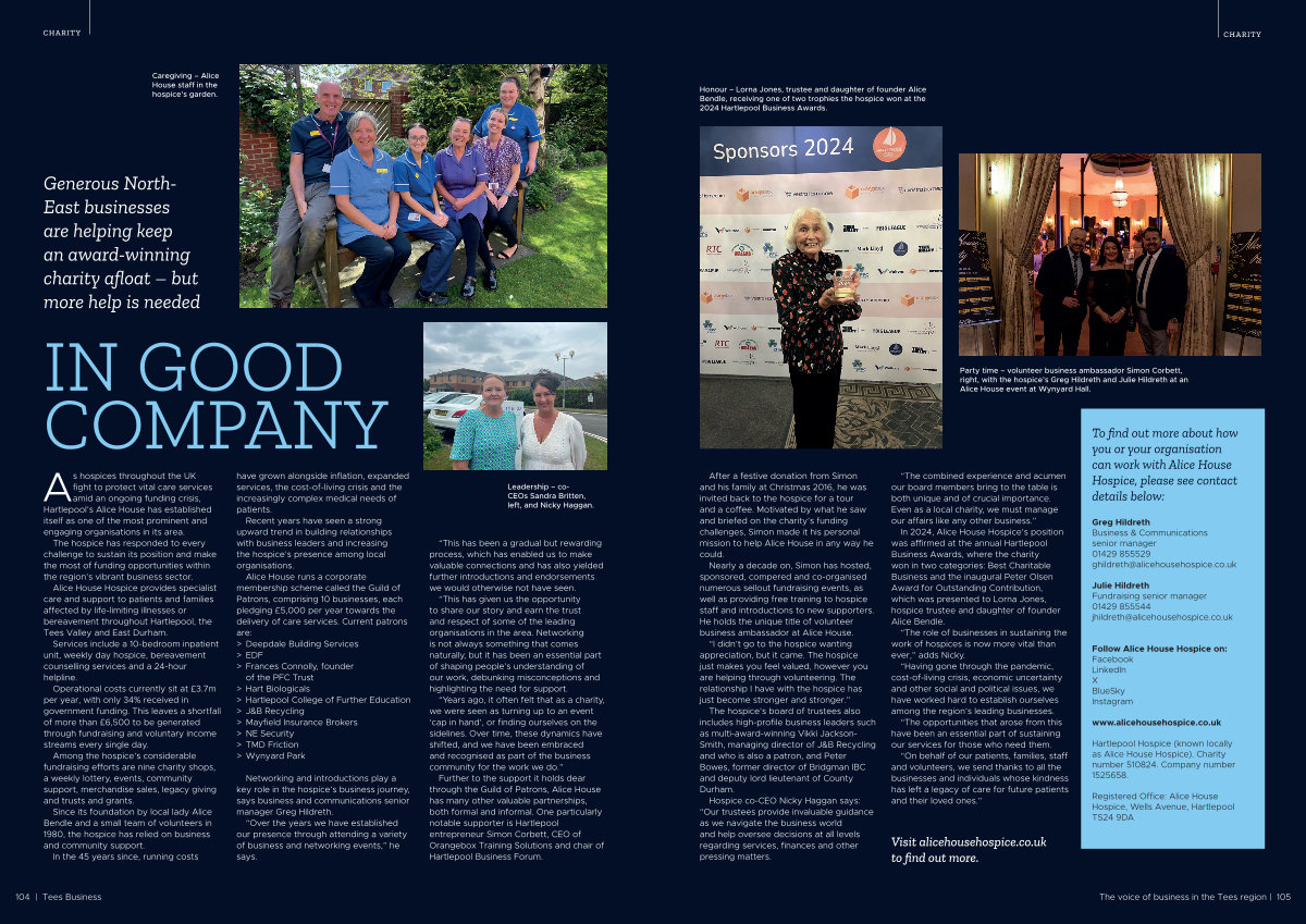 In 2024, Alice House Hospice’ s position was affirmed at the annual Hartlepool Business Awards, where the charity won in two categories: Best Charitable Business and the inaugural Peter Olsen Award for Outstanding Contribution, which was presented to Lorna Jones, hospice trustee and daughter of founder Alice Bendle.