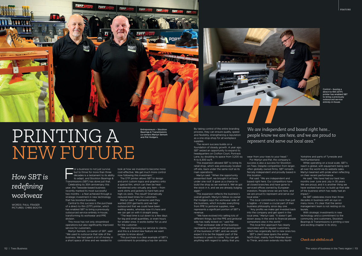 Central to this success is the purchase of a direct-to-film( DTF) printer, which has enabled SBT to bring a previously outsourced service entirely in-house, transforming its workwear and PPE division.