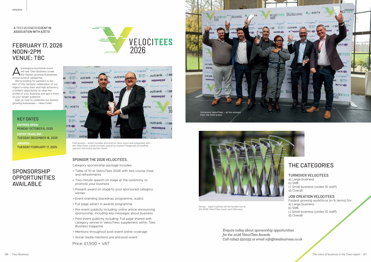 Enquire today about sponsorship opportunities for the 2026 VelociTees Awards. Call 01642 450255 or email info @ teesbusiness. co. uk