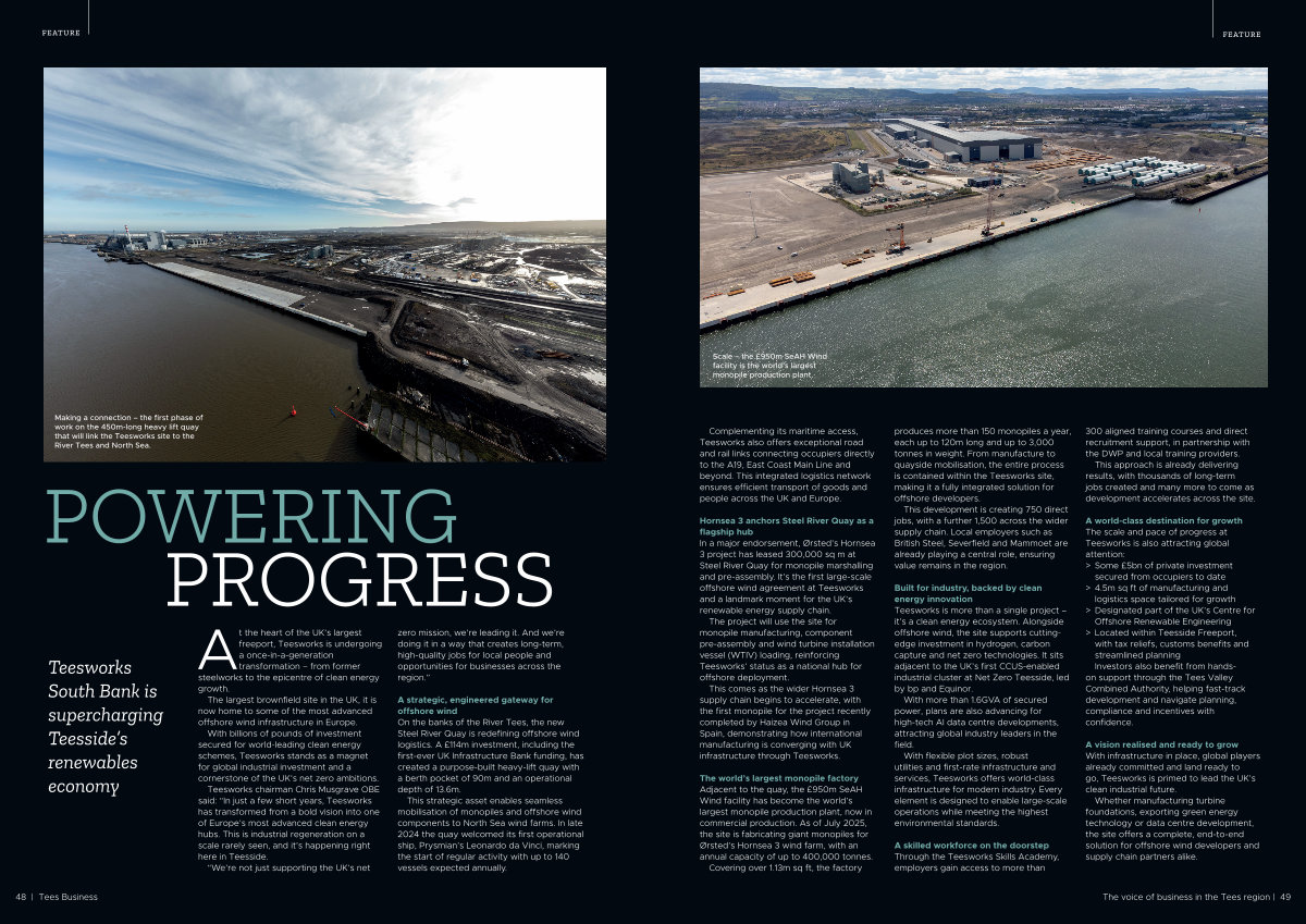 The world’ s largest monopile factory Adjacent to the quay, the £ 950m SeAH Wind facility has become the world’ s largest monopile production plant, now in commercial production. As of July 2025, the site is fabricating giant monopiles for Ørsted’ s Hornsea 3 wind farm, with an annual capacity of up to 400,000 tonnes. Covering over 1.13m sq ft, the factory produces more than 150 monopiles a year, each up to 120m long and up to 3,000 tonnes in weight. From manufacture to quayside mobilisation, the entire process is contained within the Teesworks site, making it a fully integrated solution for offshore developers.