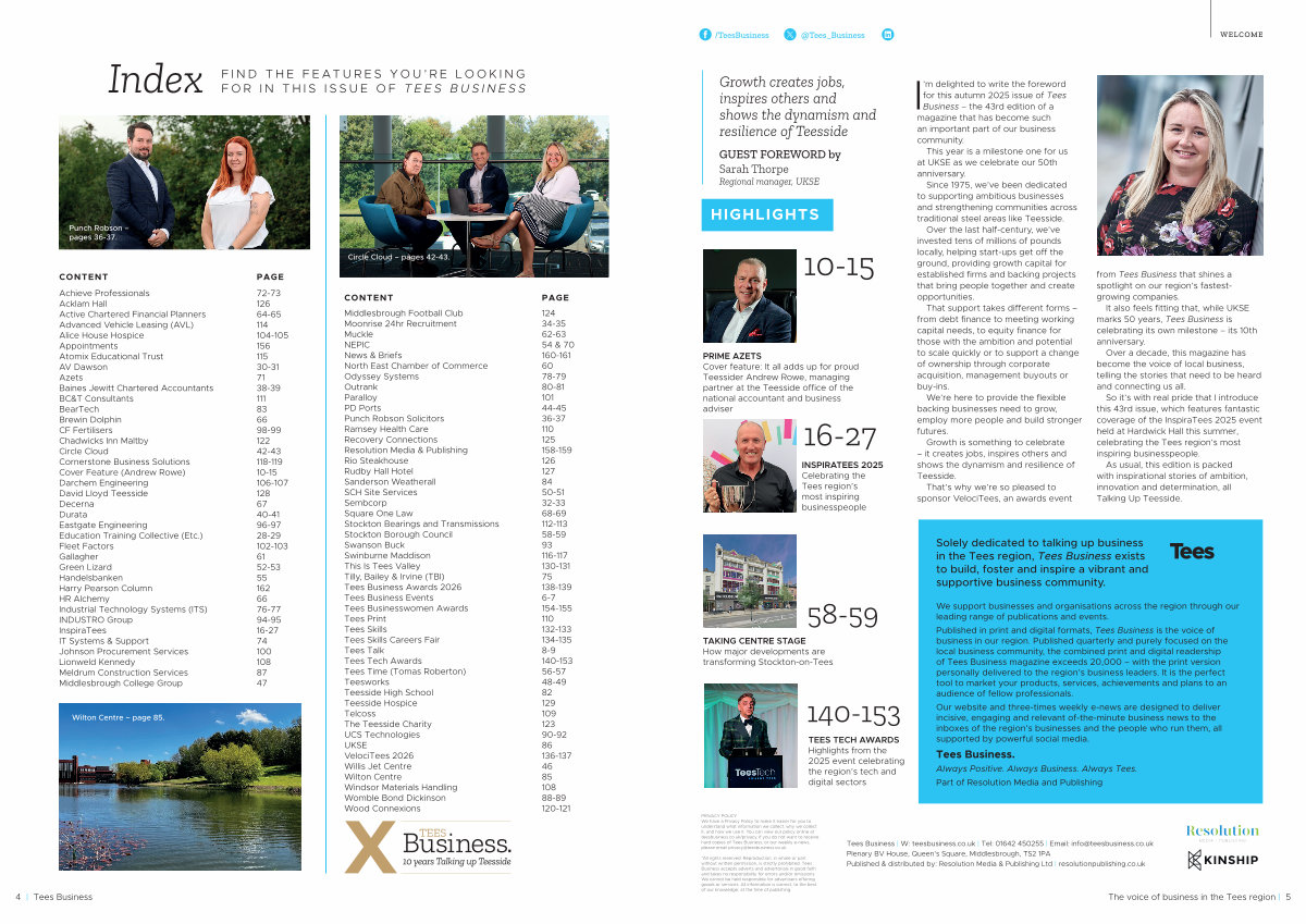So it’ s with real pride that I introduce this 43rd issue, which features fantastic coverage of the InspiraTees 2025 event held at Hardwick Hall this summer, celebrating the Tees region’ s most inspiring businesspeople.