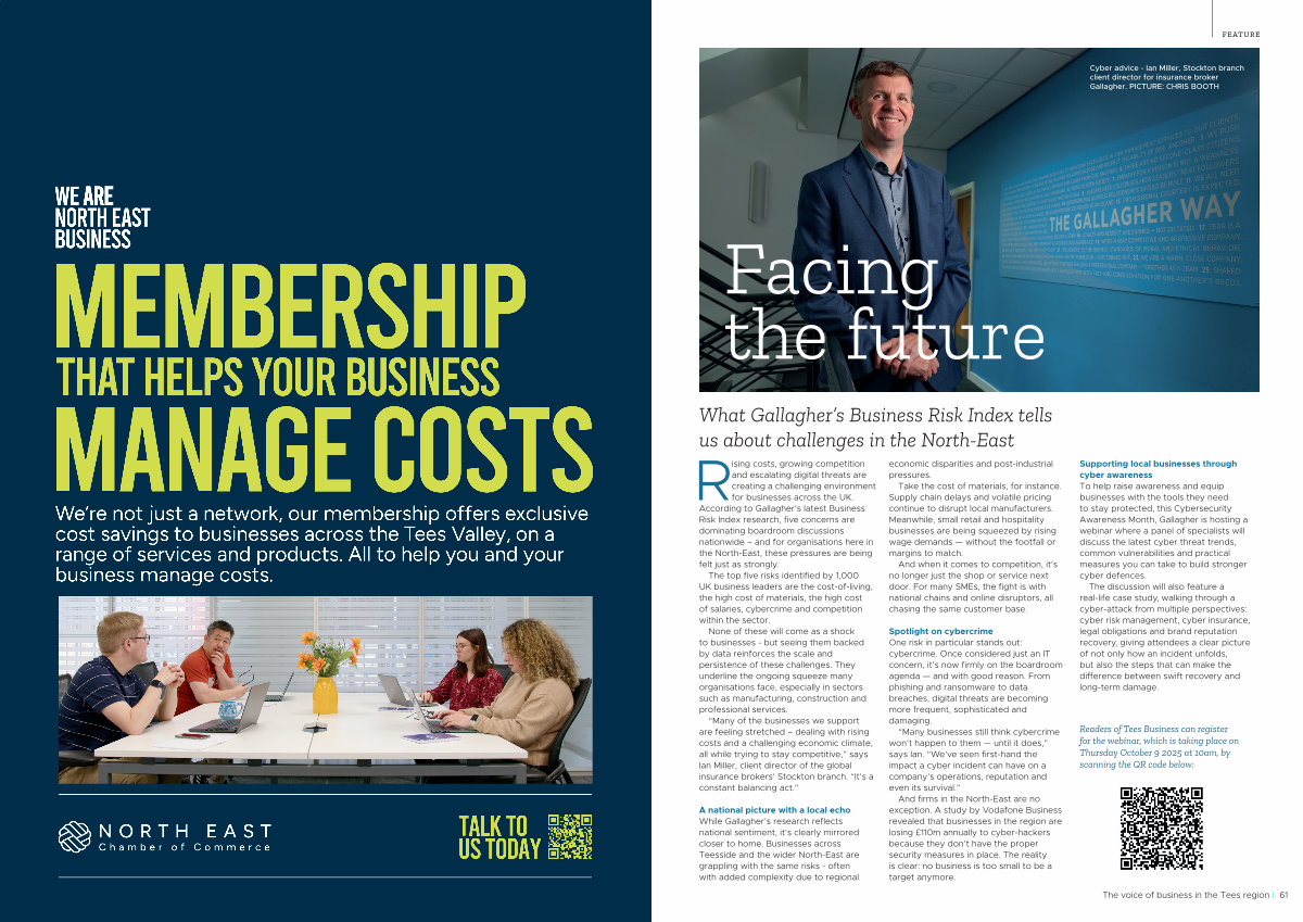 Rising costs, growing competition and escalating digital threats are creating a challenging environment for businesses across the UK. According to Gallagher’ s latest Business Risk Index research, five concerns are dominating boardroom discussions nationwide – and for organisations here in the North-East, these pressures are being felt just as strongly.