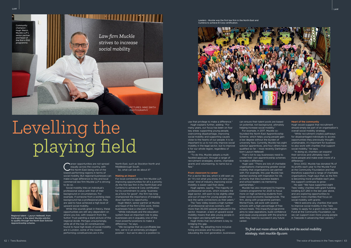 For example, in 2017, Muckle cofounded the North East Apprenticeship Scheme, which helps young people gain a law degree without the burden of university fees. Currently, Muckle has eight solicitor apprentices, and four others have qualified so far – most recently Darlingtonborn Lauryn Hellewell.