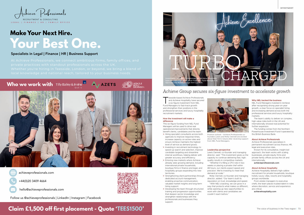 Teesside-based Achieve Professionals and Achieve Hospitality have secured a six-figure investment from NEL Fund Managers to fast-track growth and strengthen their positions in the professional services and luxury hospitality recruitment markets.