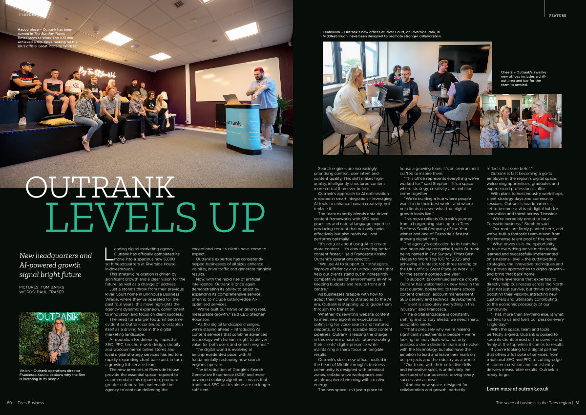 Leading digital marketing agency Outrank has officially completed its move into a spacious new 6,000 sq ft headquarters at Riverside House, Middlesbrough.