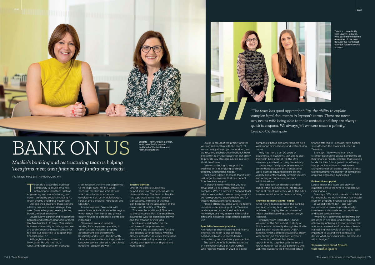 Louise Duffy, partner and head of the banking and restructuring team at local law firm Muckle LLP, says:“ Teesside’ s business community is thriving, and we are seeing more and more companies tap into our expertise to support their financial growth.”