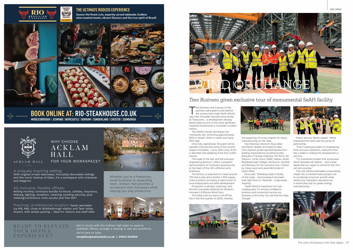 Tees Business and a group of key partners were given a rare behindthe-scenes look inside SeAH Wind’ s vast new monopile manufacturing facility at Teesworks – a development already being hailed as one of the most significant industrial investments in Teesside’ s modern history.