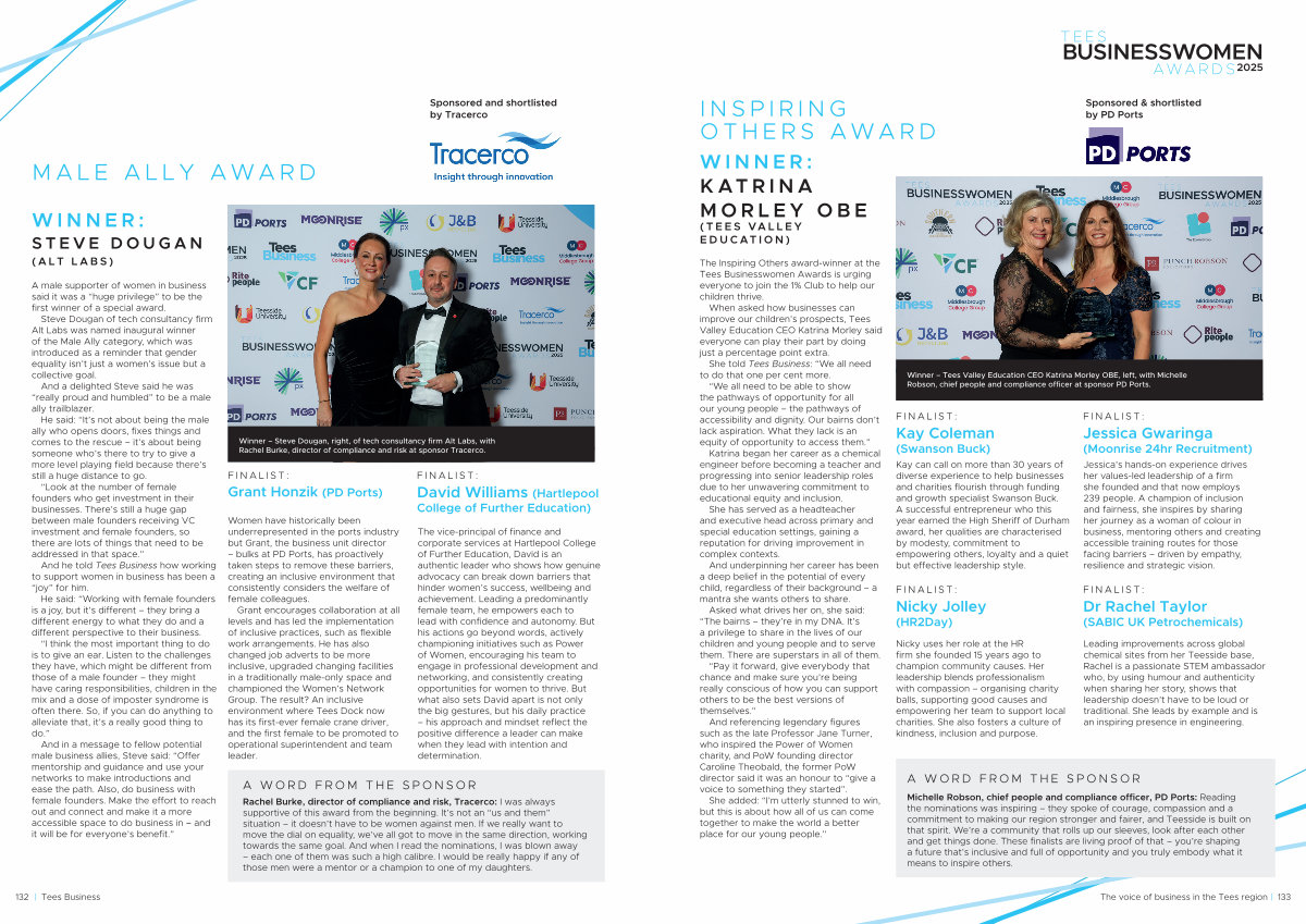 Michelle Robson, chief people and compliance officer, PD Ports: Reading the nominations was inspiring – they spoke of courage, compassion and a commitment to making our region stronger and fairer, and Teesside is built on that spirit. We’ re a community that rolls up our sleeves, look after each other and get things done. These finalists are living proof of that – you’ re shaping a future that’ s inclusive and full of opportunity and you truly embody what it means to inspire others.