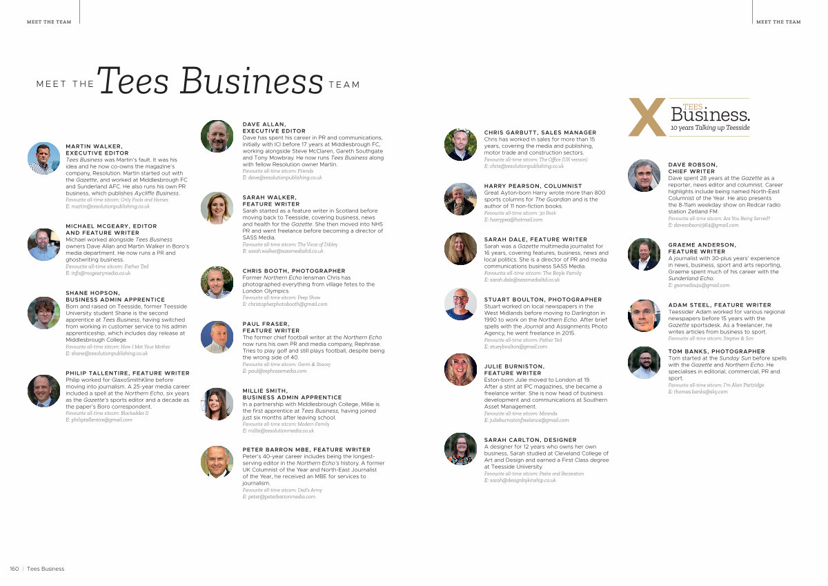 MARTIN WALKER, EXECUTIVE EDITOR Tees Business was Martin’ s fault. It was his idea and he now co-owns the magazine’ s company, Resolution. Martin started out with the Gazette, and worked at Middlesbrough FC and Sunderland AFC. He also runs his own PR business, which publishes Aycliffe Business. Favourite all-time sitcom: Only Fools and Horses E: martin @ resolutionpublishing. co. uk