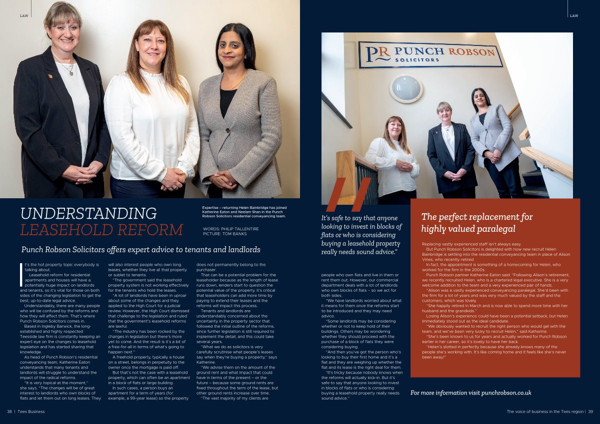 Based in Ingleby Barwick, the longestablished and highly respected Teesside law firm is constantly keeping an expert eye on the changes to leasehold legislation and has started sharing that knowledge.