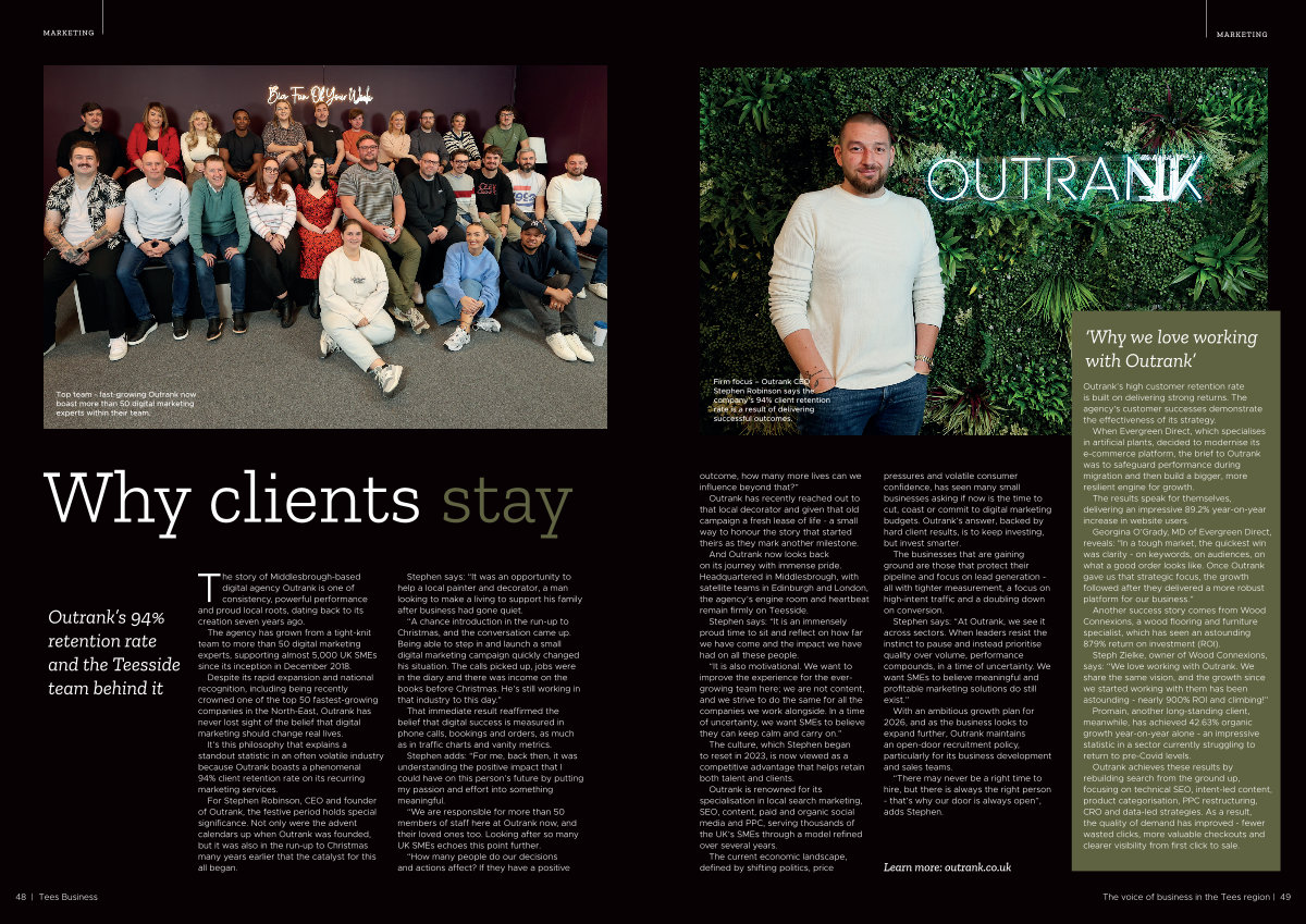 And Outrank now looks back on its journey with immense pride. Headquartered in Middlesbrough, with satellite teams in Edinburgh and London, the agency’ s engine room and heartbeat remain firmly on Teesside.