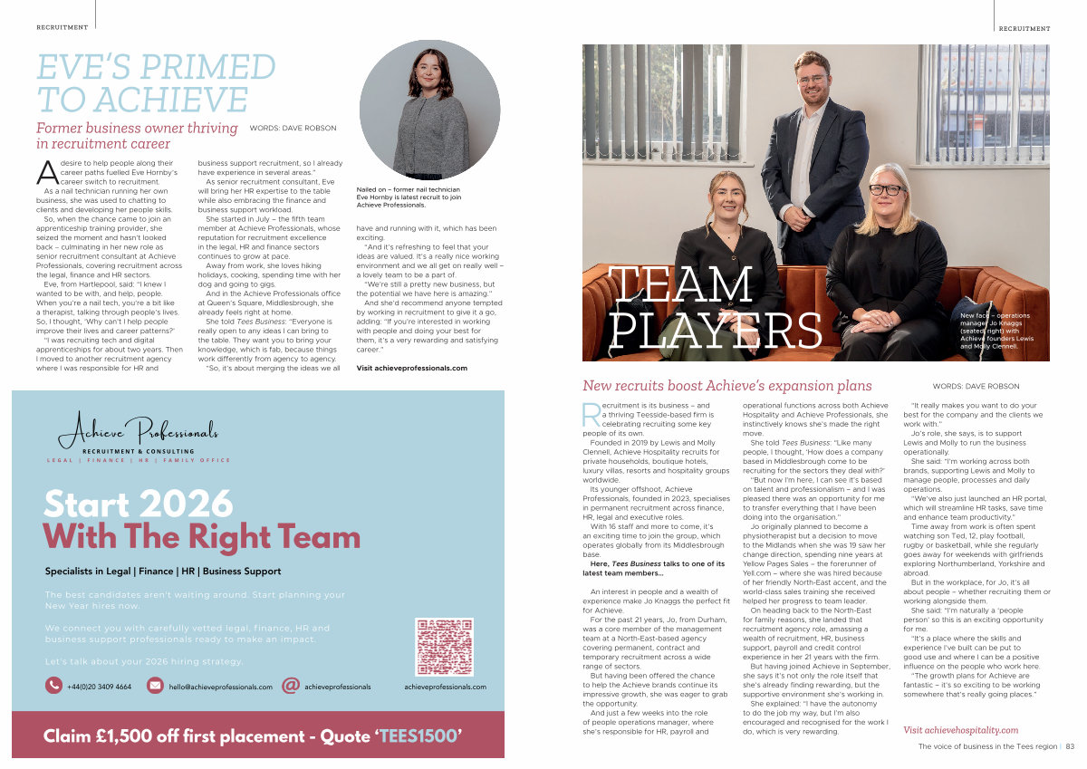 Its younger offshoot, Achieve Professionals, founded in 2023, specialises in permanent recruitment across finance, HR, legal and executive roles.