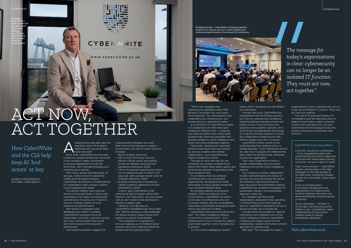 Talking to Tees Business at CyberWhite’ s Middlesbrough office, Matt said:“ We’ re entering an unprecedented era where AI gives cybercriminals 24 / 7 capacity to exploit vulnerabilities.